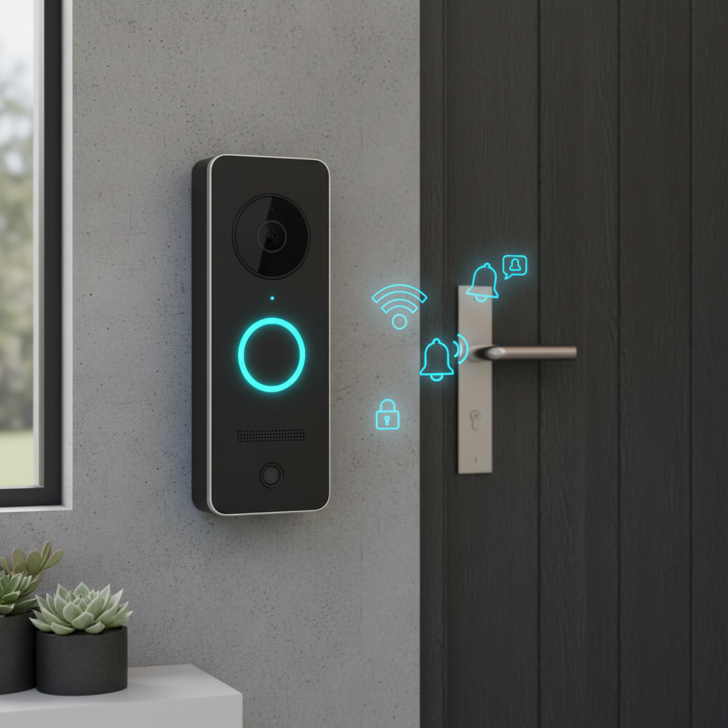 A Campainha Inteligente com Câmera aumenta a segurança de entradas residenciais, permitindo visualizar visitantes em tempo real pelo celular. Com notificações instantâneas, você é avisado quando alguém se aproxima ou aciona a campainha.